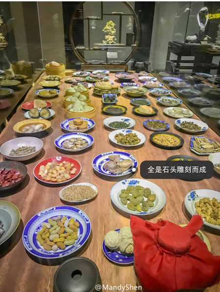 石头记历经数十年收集苍天造物、自然天成的各种"食"材,并礼请著名工艺美术师主持,动员上百名技艺精湛的能工巧匠通过三年多的集体创作,终于端出此一席四大桌,内有农家风味、山珍、海味、小吃等,款款美食栩栩如真,令人垂涎欲滴,堪称世界第一冠绝古今的石宴大全。